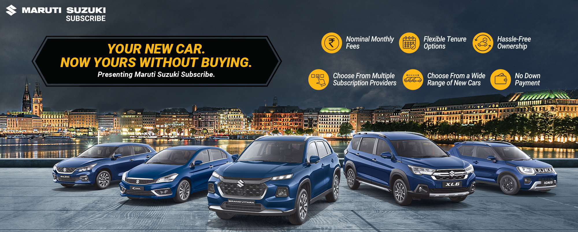 Maruti Suzuki Subscribe enables all customers to enjoy driving their preferred Maruti Suzuki cars without having to deal with all the financial responsibilities that come with owning a car.All you need to do is opt for a monthly subscription plan at a fixed monthly fee, which includes the routine maintenance and insurance costs, and choose a flexible tenure. At Adarsha Auto World Pvt. Ltd. in, , Warangal, all Hatchback, Sedan, SUV, the MUV models line-up includes Baleno, Invicto, EVitara, Jimny, Ciaz, Ignis, Fronx, Grand Vitara, XL6. Here, you will enjoy Maruti Suzuki Subscribe benefits such as: